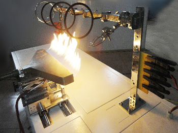 ◆ Water spray: A spray noozle (see pic-4) is installed on the test support (see pic 2, 3), just middle of the burner. Water pressures: 250KPa~350KPa. Spray water 0.25L/m2~0.30L/m2around sample. This spraying rate needs to use collection tray to measure. This tray has enough depth, to let its long axis parallel to the axis of the cable and in the middle place. It’s about 100mm in width, 400 in length.